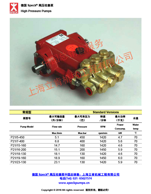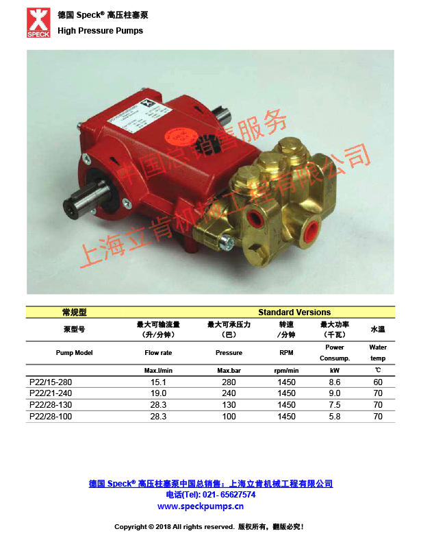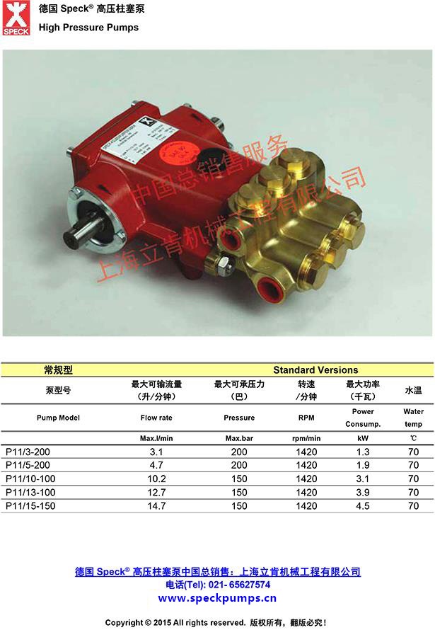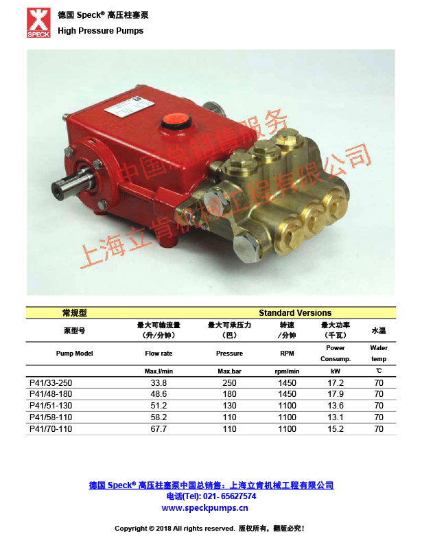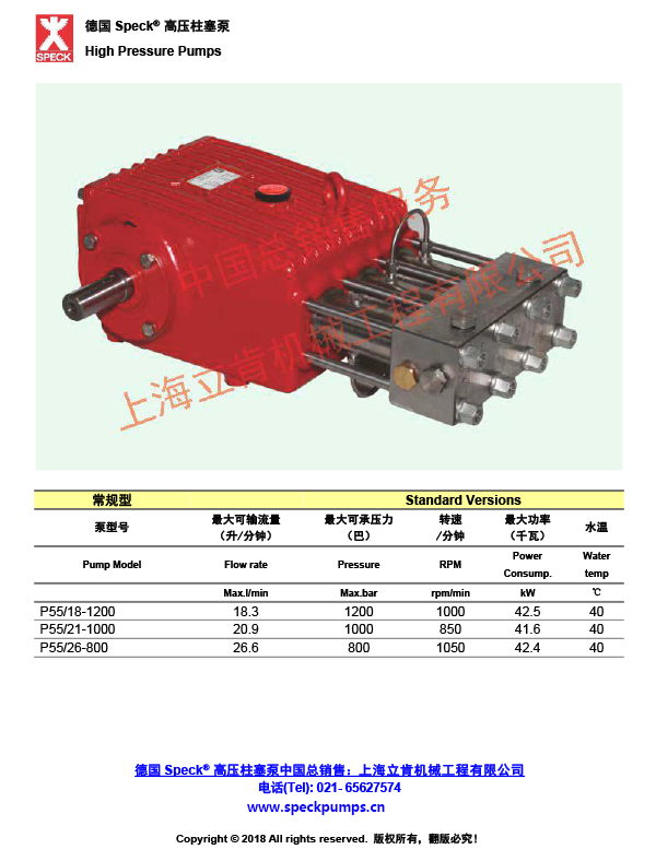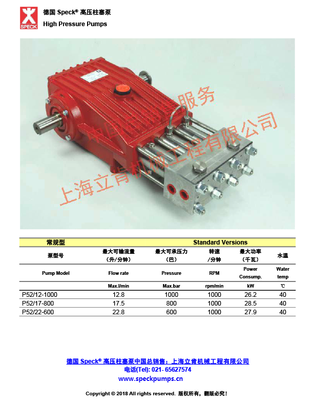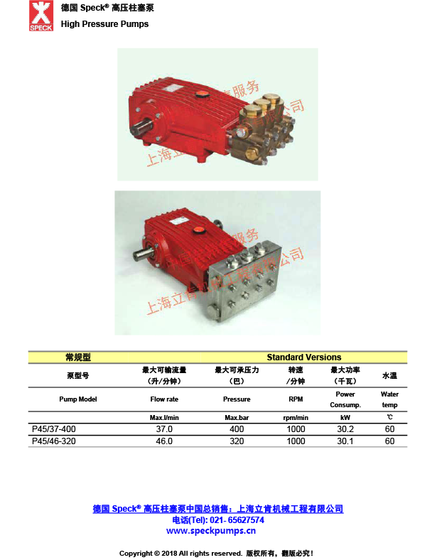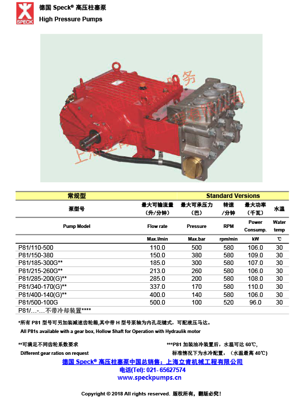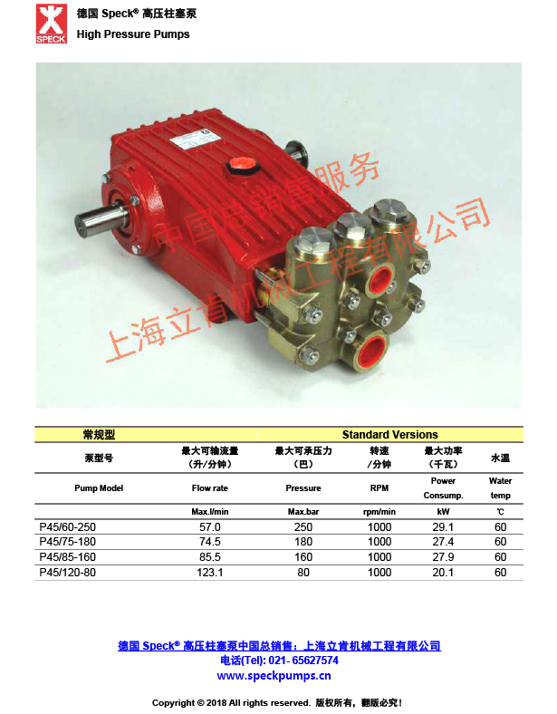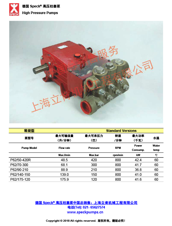 Speck的高壓泵最高壓力從100bar~2000bar不等,最大流量從1.2L/min ~ 650L/min不等,泵頭材質有特種黃銅、有耐海水型鋁青銅、有耐酸堿型316L不銹鋼、有高級別雙相鋼型等。種類除常規大類外還有二氧化碳泵、海水泵、膨潤土泥漿泵、試壓泵、高溫泵、發泡機用泵等,幾乎涵蓋了各行各業不同領域和不同用途之所需。