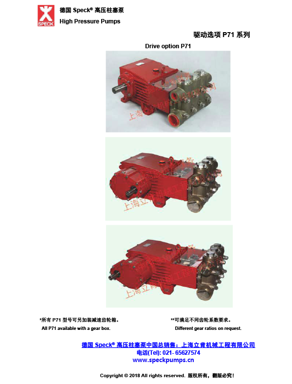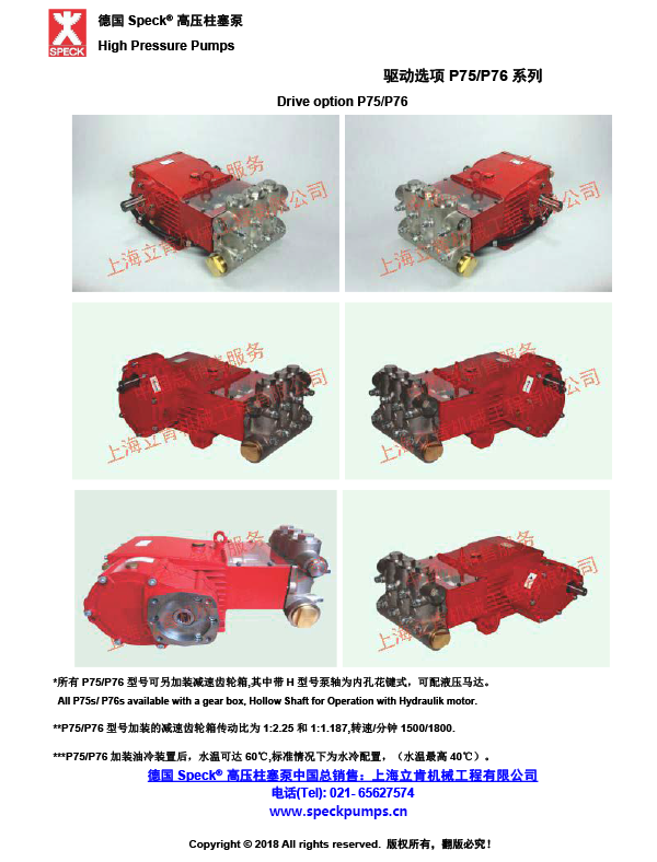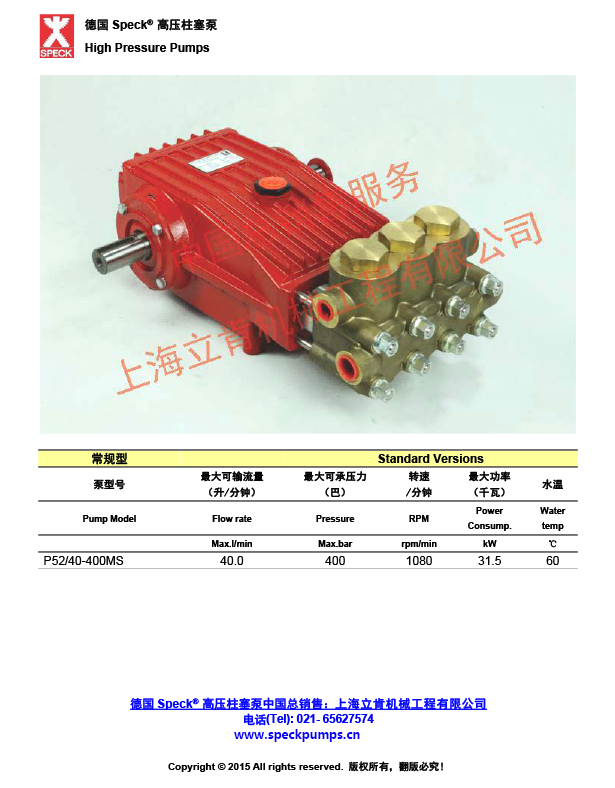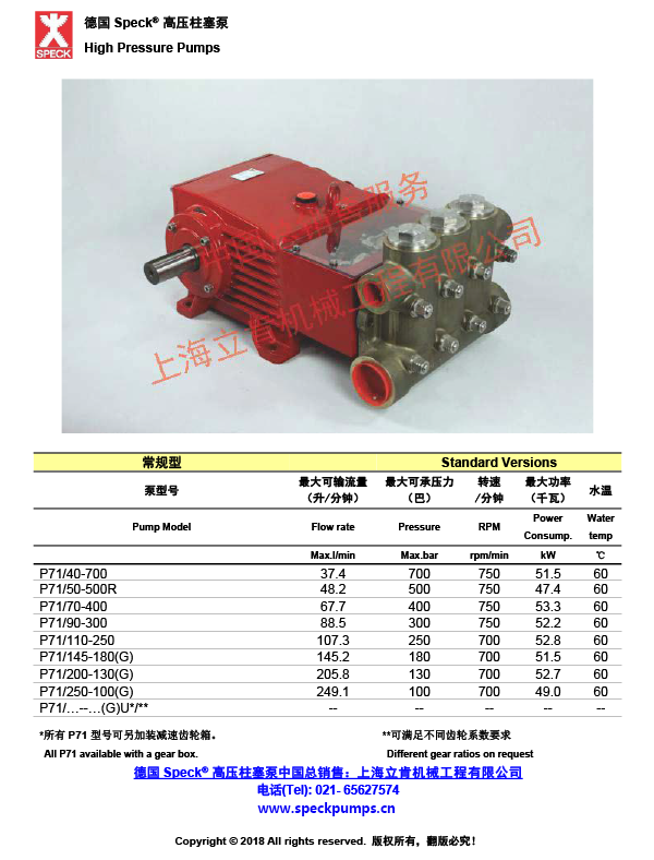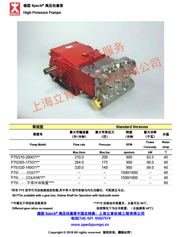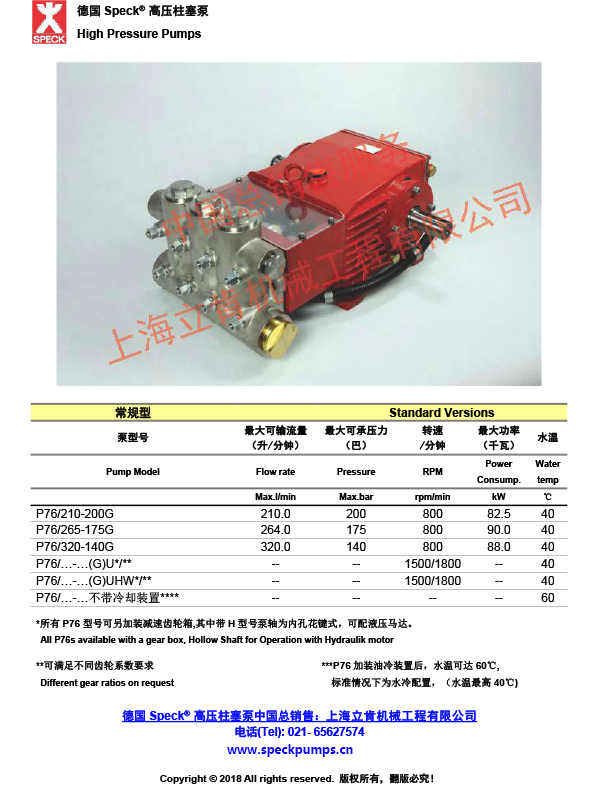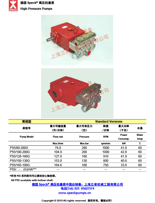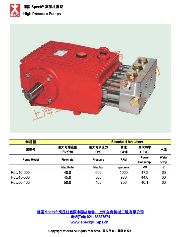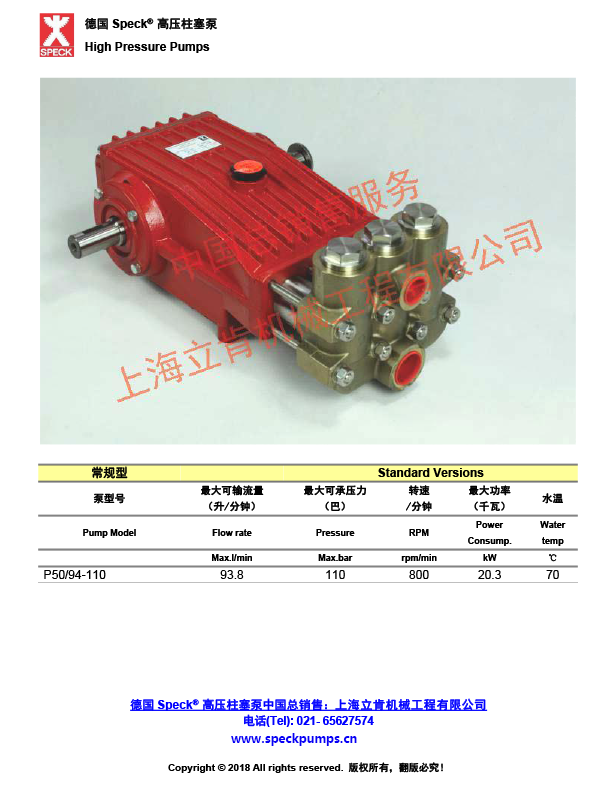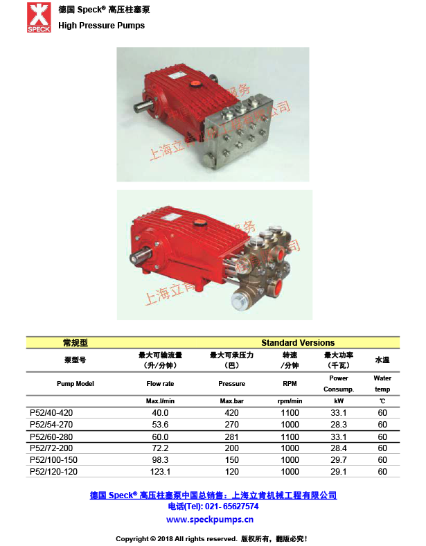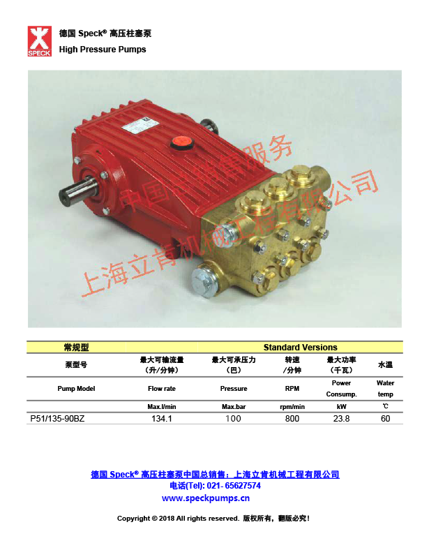 Speck的高壓泵最高壓力從100bar~2000bar不等,最大流量從1.2L/min ~ 650L/min不等,泵頭材質有特種黃銅、有耐海水型鋁青銅、有耐酸堿型316L不銹鋼、有高級別雙相鋼型等。種類除常規大類外還有二氧化碳泵、海水泵、膨潤土泥漿泵、試壓泵、高溫泵、發泡機用泵等,幾乎涵蓋了各行各業不同領域和不同用途之所需。